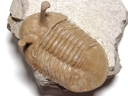 ロシア産オルドビス紀三葉虫の最も代表的な属であるAsaphus (アサフス)の中で、最も広く認知されている種類は、やはりこのAsaphus kowalewskii (アサフス コワレウスキイ)ではないでしょうか。このカタツムリか潜望鏡のような長い眼は、多くの堆積物がたまった海底から視界を確保するために発達したと考えられています。ロシア・オルドビス紀の地層からは、Asaphus (アサフス)だけでもたくさん種類が産出しますが、その種を年代の古い順に追っていきますと、ある系統のものはこのように眼の軸の長さがだんだん長く進化しているそうです。